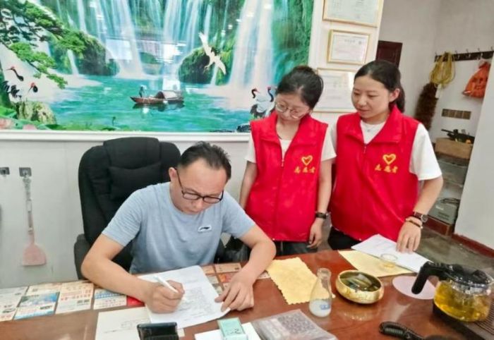 图为商户正在填写队员们提供的调查问卷(霍熙睿摄)