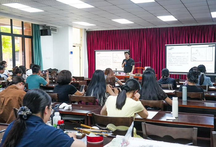 在实践环节,许老师更是倾囊相授,亲自指导学员们完成了从命题选题、绘制实施到作品收尾整理的全流程创作。这一过程不仅让学员们亲身体验了中式美学的独特魅力,更让他们在传统艺术形式中找到了创作的乐趣与灵感。整个培训过程中,许老师的讲解深入浅出,逻辑清晰,使得老师们在轻松愉快的氛围中收获了满满的知识与技能。