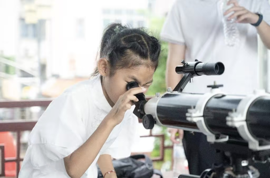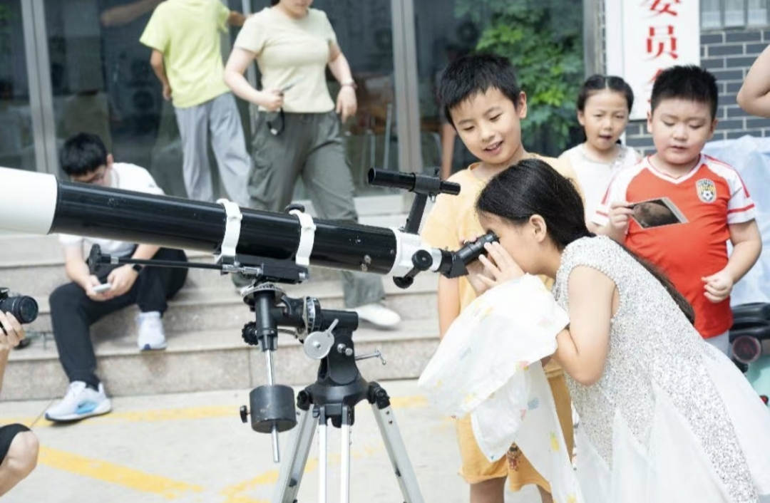 图为南池社区儿童用天文望远镜观测远处景物。