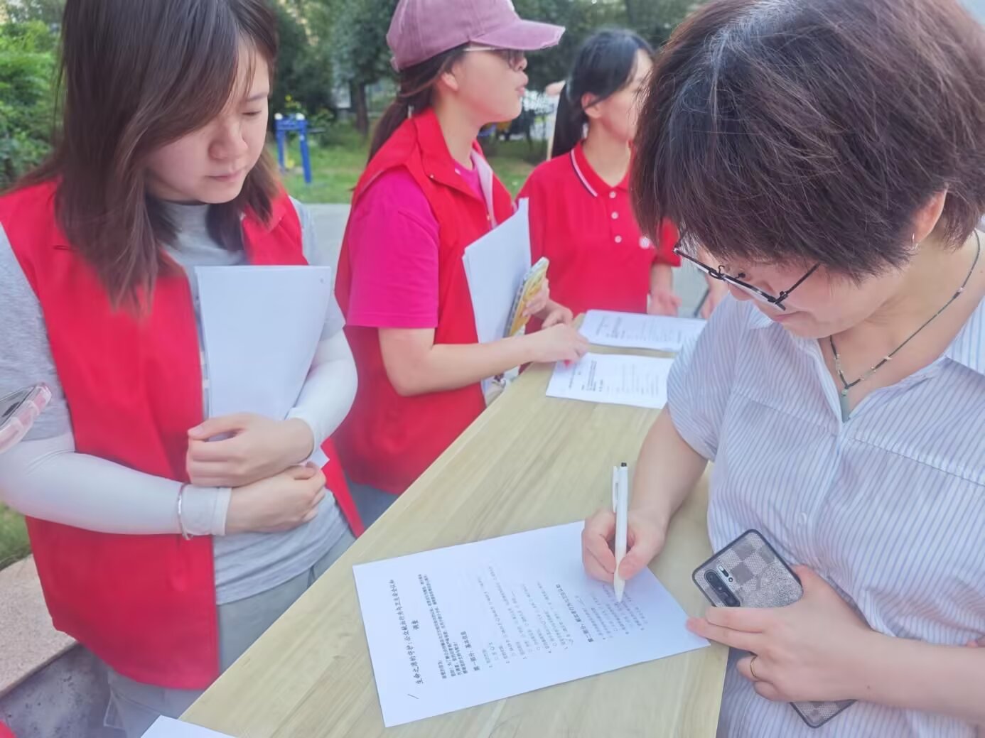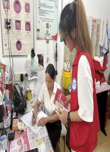 图为团队成员向诊所的医护人员进行问卷调查与宣传。张健 供图 覆盖草城街社区,宣传触角无死角 7月6日,团队在草城街社区设起宣传展台,铺开印有献血知识的展板,桌上整齐摆放着问卷、宣传单页和小份纪念品。志愿者们分工明确,有的向驻足的居民招手示意:“来看看无偿献血的知识吧,填份问卷还能领份小礼物~”,有的指着展板上的流程图,给围拢过来的老人讲解献血前的检查项目和流程时长,还有的拿着宣传单追上前询问路边行人:“您了解过无偿献血吗?这上面有具体的益处说明,您可以看看。”展台前的人流来来往往,提问声、讲解声和笑声交织在一起,让无偿献血的知识随着这份热闹,悄悄走进了更多居民心里。