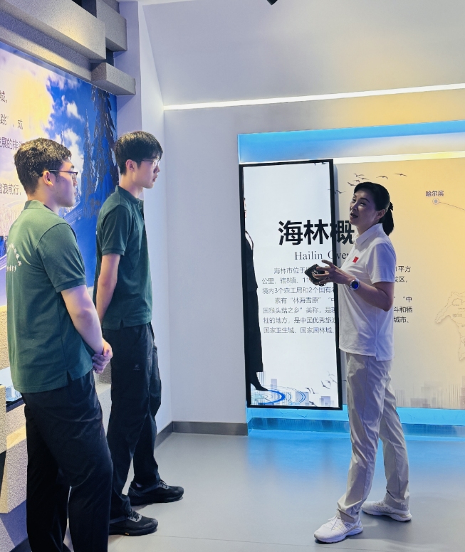 区位地图与领导关怀视频展区,让实践队成员对区域发展的支撑体系有了更立体的认知。电子屏上展示的黑龙江省地图与海林市地图吸引队员们驻足,俯身细看城市与乡镇的分布脉络,直观感受到区域发展的地理基底。转至领导关怀视频区,看着各级调研中对城乡协同的细致叮嘱、对乡镇产业的具体指导,队员们深刻感悟到区域发展的联动,既需地理的天然联结,更需各方主动串联,作为土木与交通学院的学子,正是串联这些脉络的关键一环。