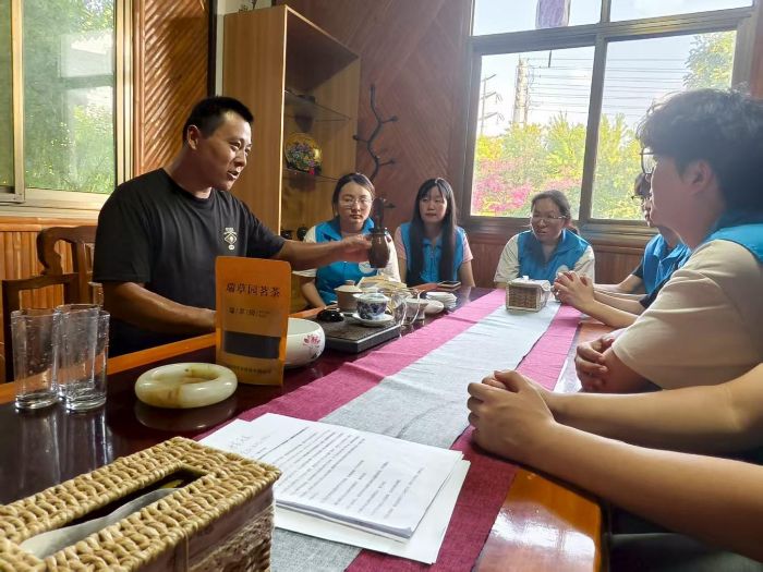 在等待过程中,尹经理详细介绍了专业评茶的工具与流程——从用于称量的天平、盛放茶汤的评茶杯碗,到记录口感的评分表,一套标准化的评茶体系让实践团成员们明白,看似简单的品茶实则是对茶叶外形、汤色、香气、滋味、叶底的系统考量。他特别提到,在国家推动茶产业标准化、品牌化发展的当下,科学评茶不仅是提升茶叶品质的关键,更是让中国茶走向世界的重要底气。