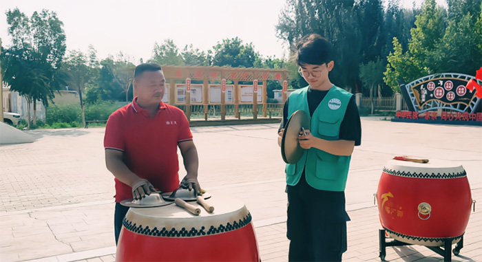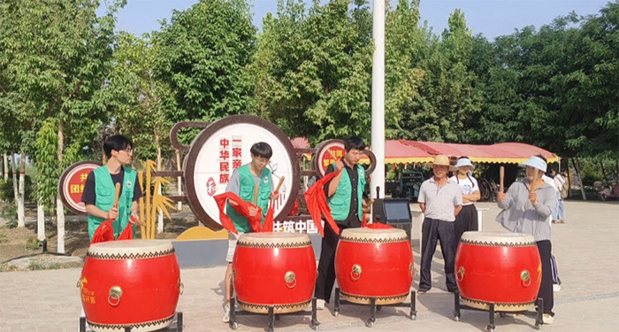 2025年7月7日,“藕”然遇“碱”“林”三下乡实践团队与阿拉尔市十六团一营一连工作人员齐聚一堂,以扭秧歌、敲红鼓、打镲等红色非遗体验为核心,共同排练节目,为后续演出做准备。