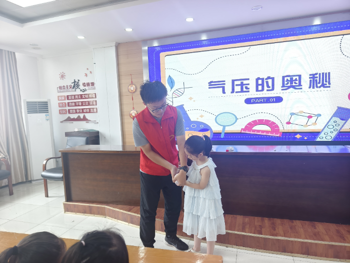 7月19日,小队成员在指导老师李天骄的带领下在扬州宝应县开展了“宏志少年”暑托班的课程。志愿者李明乐的物理小实验课上,孩子们化身“小小科学家”,沉浸式探索自然的奥秘。在“大气压与张力”环节,当看到倒置的矿泉水瓶下,紧贴瓶盖的乒乓球和纸巾竟能稳稳托住水流,孩子们纷纷瞪大双眼,忍不住伸手模仿。孩子们在动手操作中,悄悄揭开了摩擦力、密度、静电等物理原理的神秘面纱。