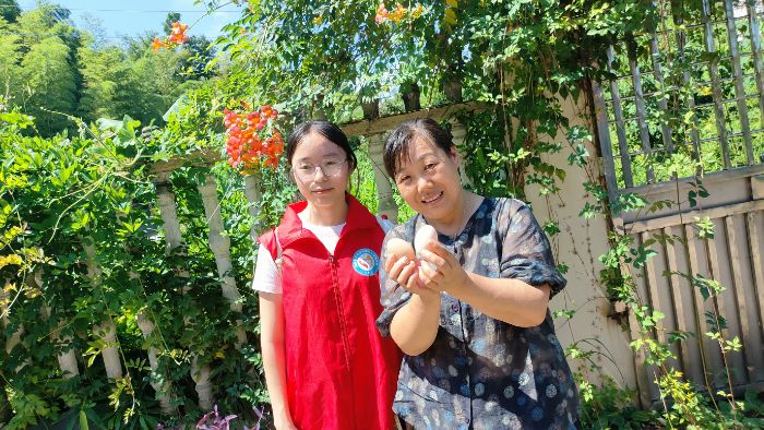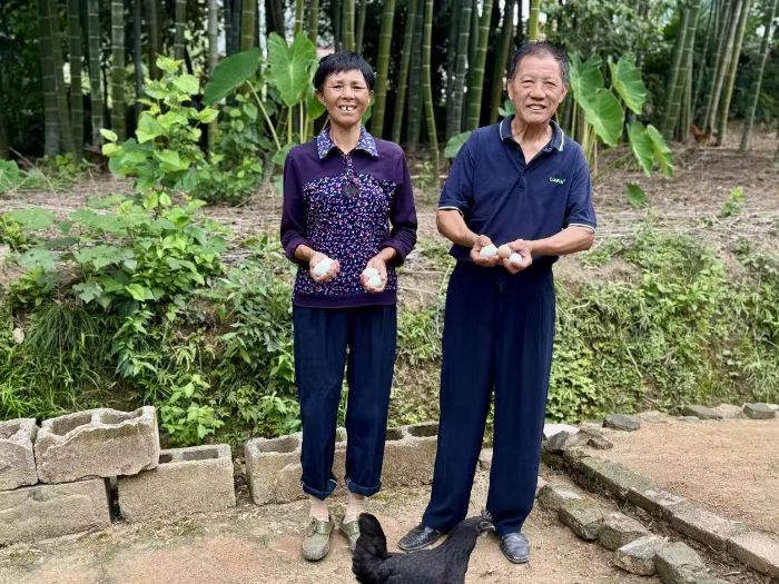 2017年青阳县将皖南土鸡列为脱贫攻坚主导产业,通过“党支部+合作社+农户”模式,让土鸡产业成为贫困户增收的核心引擎。在三义村,实践团见证了该模式的实效。调研中,实践团走访了因为养殖土鸡成功脱贫的陈翠枝奶奶一家,据当地扶贫干部介绍,2014年陈翠枝奶奶因病致贫,在村党支部牵头下陈翠枝加入合作社,通过技术帮扶、订单兜底、品牌共建等方式,仅用三年便摘掉贫困帽。“去年土鸡收入8万多,月工资4500。”陈奶奶和包爷爷的笑脸,折射出党建引领下的乡村振兴成效。