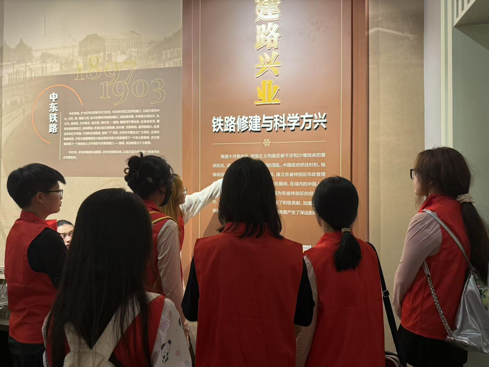 踏入馆内,时光的洪流瞬间将众人包围。“建路兴业——铁路修建与科学方兴”展区,宛如一部无声的编年史书。1897 - 1903年,中东铁路从蓝图走向现实,展板上的文字与图片,串联起无数不为人知的故事。队员们围拢在讲解队员的身旁,目光紧锁那些泛黄的资料——铁路修筑时,工程师们如何克服技术难题,工人们怎样在严寒与艰苦中坚守,这条铁路又如何成为区域发展的动脉,促进科技交流与实业萌芽。