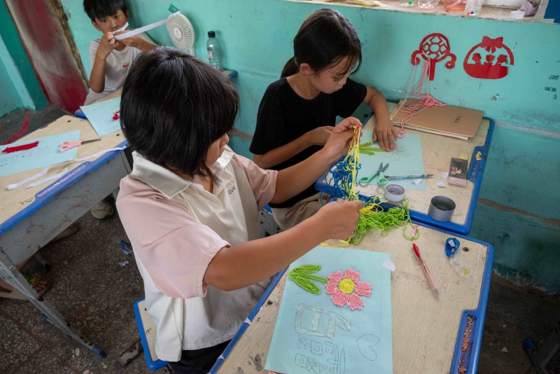 美术课上同学在制作毛线画 郑博涵摄