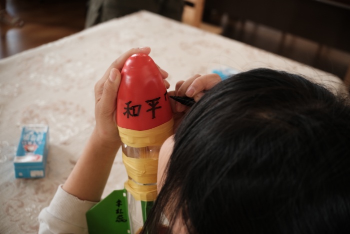 水火箭的制作及发射环节要求各组在一小时内通过云南校友会提供的标准化制作材料包,将包含塑料瓶、导流管、尾翼等组件独立组装成一级水火箭并进行简单装饰与命名。对于和平号水火箭的命名鲁云悦说“祖国的和平来之不易,希望中国一直繁荣下去”。队员赵子鑫通过带有压力表的专用打气筒为各组水火箭进行加压,在声声“三、二、一”的倒数中学生拉下控制阀,一支支承载着学生质朴愿望的水火箭升上天空。在小组总结中,学生讨论水火箭的不足与改进方法,吕富梁说“这次水火箭的制作活动让我了解到了许多知识,我不仅学到了航天知识也了解到团队合作的重要性”。