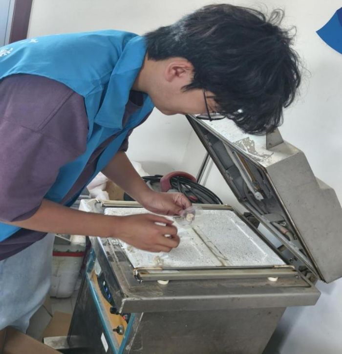在介绍完爬宠食品的包装之后,工作人员还向成员们展示了不同类型的运输包装容器,并讲解了它们的优缺点。实践团成员们亲身体验了冻干的包装及真空压缩的过程,了解了运输包装的特点以及模式。