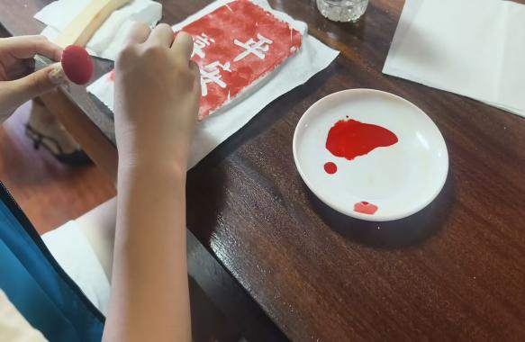 理论讲解结束后,实践体验环节有序开展。在江老师的现场指导下,师生们分组进行拓印操作:从宣纸的软化处理、碑刻表面的贴合技巧,到拓包的墨量控制、拍打力度的均匀把控,每一个步骤都严格遵循传统规范。过程中,大家克服了宣纸破损、字迹模糊等问题,逐渐掌握操作要领。当一张张墨色均匀、字迹清晰的拓片完成时,参与学生表示,亲手实践让自己真切体会到“匠心”二字的分量,也深刻理解了非遗传承中“守正”与“创新”的辩证关系。