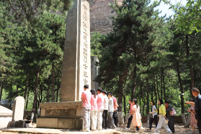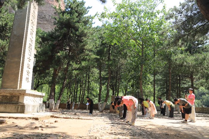 实践团在烈士陵园举行了庄重的纪念宣誓仪式。在青松翠柏环绕的陵园中,成员们向黄崖洞保卫战牺牲的烈士敬献花朵,鞠躬默哀,表达对革命先烈的深切缅怀与崇高敬意。