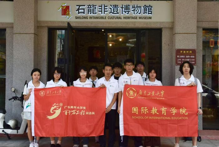 图7: 广东工业大学国际教育学院“数字醒狮”实践队在石龙非遗博物馆前合影。(刘佳豪 摄)