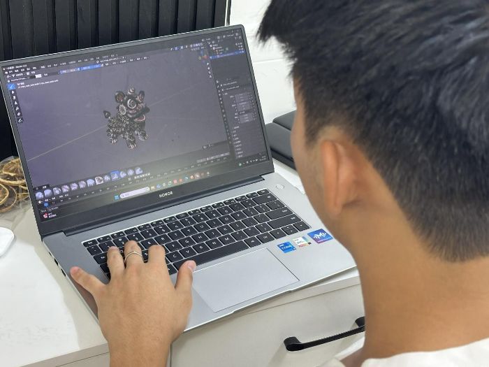图5: 技术组成员在工作室利用3D建模软件精细调整醒狮模型。(陈纯敏 摄)