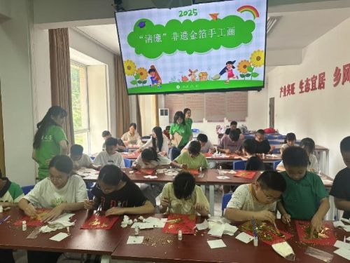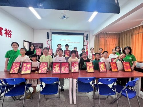 宣讲结束后,实践队队员组织阳春村小学生开展“清廉”为主题的非遗金箔手工活动。队员们向在场学生和部分村民介绍了金箔非遗技艺的源流,之后指导他们打线稿、贴金箔,共同完成了“廉洁”“清正”等字样的非遗金箔画。孩子们和村民对理论宣讲和非遗金箔画制作非常喜欢。孩子们表示,习近平爷爷勤俭节约、“自找苦吃”的精神深深打动了他们,他们要以习近平爷爷为榜样,好好学习,不怕吃苦,勤于思考,孝敬父母!村民代表林娟则表示,理论宣讲和金箔画制作让他们和当地孩子感受到总书记所说“以千千万万家庭的好家风支撑起全社会的好风气”的深刻含义,同时也感谢队员们的辛勤付出,让乡村孩子也有体验中华传统非遗文化魅力的机会,让孩子们在实践中接受到廉洁文化的熏陶。