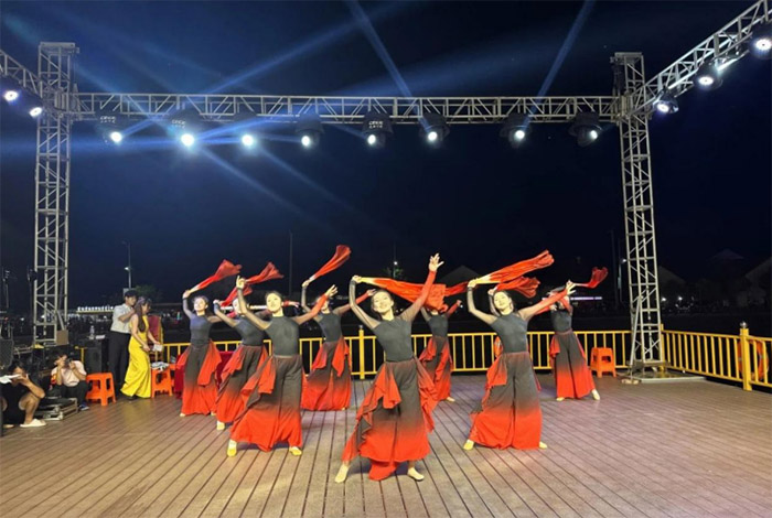 图为实践团成员表演舞蹈《光亮》,舞姿轻盈,灯光下尽显青春风采。张艺萌摄。