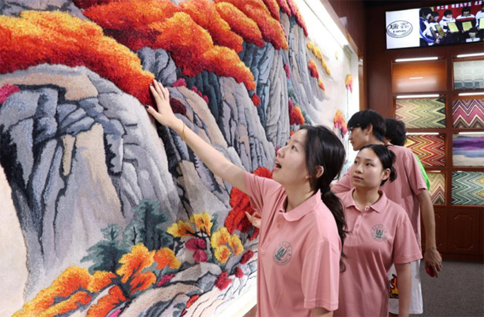 图为队员们认真观察地毯图案,感受传统工艺与现代设计的融合。李雨璇摄。