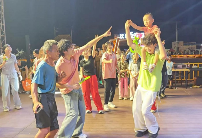 精彩的表演赢得了村民们的阵阵掌声,演出结束后,大家纷纷涌上舞台,与队员们载歌载舞,欢声笑语回荡在夜空中。