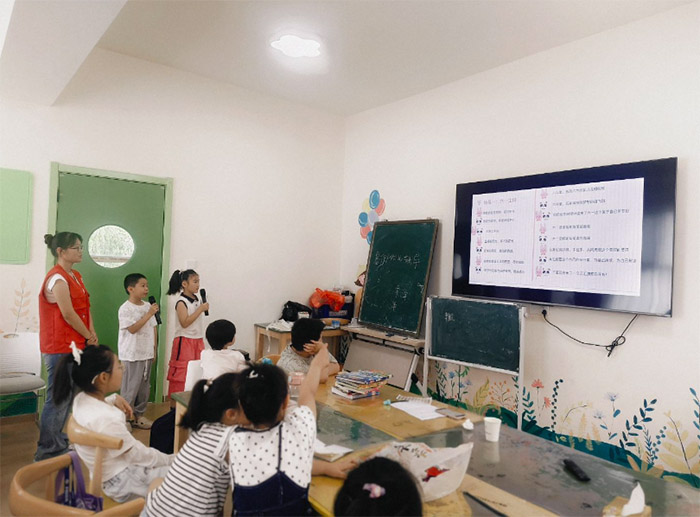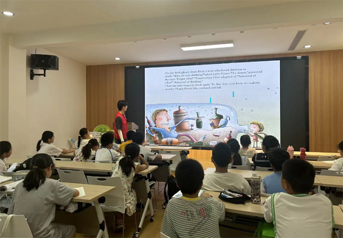英语故事课堂上,志愿者以经典英文故事为载体,用生动的讲述、趣味互动,带孩子们走进奇妙的英语世界。大屏幕上,《小王子》的英文片段搭配童趣插画,志愿者用易懂的英语、活泼的肢体动作,拆解故事里的词汇与情节。从“drinking(喝酒)”“forget(忘记)”等单词学习,到探讨故事中“不断犯错”的寓意,孩子们睁大眼睛,专注聆听、积极回应,在沉浸式体验中,既提升了英语听说能力,又接触到文学、哲理知识。