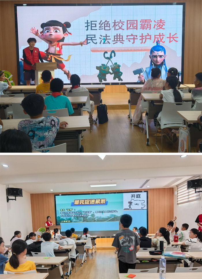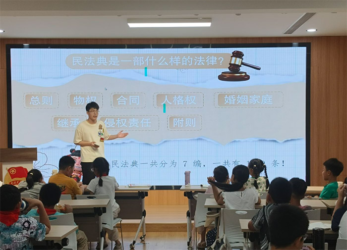 在实践营里,法治教育摆脱了原本的枯燥,而变得生动有趣起来。“拒绝校园霸凌”的主题课上,大学生志愿者们精心设计模拟法庭环节,孩子们头戴法官帽、身披律师袍,扮演着不同的角色。而针对校园当中可能出现的霸凌场景,“小法官”公正裁决,“小律师”据理力争,通过激烈的辩论和讨论,让孩子们深入理解了《未成年人保护法》中有关于校园安全、人身权益的条款,更加明白在以后应该如何用法律武器来保护自己。