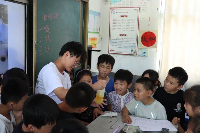 调研最后,团队走进淮阴区马头镇码头中心小学和盱眙县黄花塘镇旧铺社区暑托班,结合调研收获,梳理专业知识,为这里的乡镇小学生开设“循淮水足迹,筑治污防线”污水知识小课堂。课堂上,队员们从污水的来源切入,用通俗易懂的语言讲解了污水对自然环境、动植物及人体的危害,介绍了污水处理流程与再生水利用方式。讲解内容贴近生活实际,如生活中可对洗菜淘米水进行二次利用、工地周围喷洒水雾是为了降尘等,都是孩子们生活中可见可学的事例。