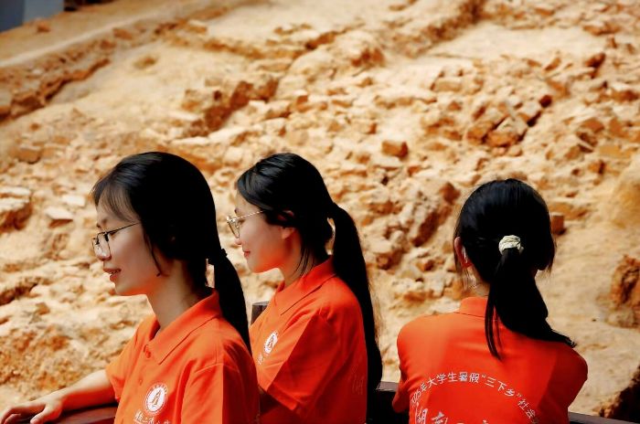 (图1:7月12日团队成员向颂月摄 - 实践团成员凝视谭家坡龙窑窑壁支钉遗痕)