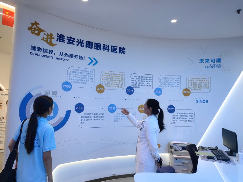上午9时,姜苏副院长陪同团队参观医院。从贫困患者救助通道的标识牌,到医疗质量管控体系的标准化流程展示墙,再到社区公益筛查活动的照片集锦,每一处细节都彰显着医院“精准医疗、公益惠民”的理念。姜副院长介绍,医院自创立之初便聚焦淮安地区眼科资源不均问题,通过制度设计将社会责任融入日常——从贫困患者费用减免机制,到每台手术的标准流程管控,再到定期进社区、学校的公益服务,让“服务为本”的初心落地为具体行动。