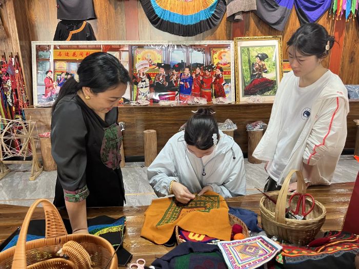 在马边彝族自治县,花间刺绣工坊市级非遗传承人曲别李英老师向团队介绍,彝族刺绣已成为当地中小学的特色课程,孩子们用稚嫩的小手,一针一线绣出彝绣文化的模样,每一针都在诉说彝家儿女的故事,每一色都晕染着大山的灵韵。她还分享了小凉山彝绣与羌绣、蜀绣等交融共生的发展历程,也谈及传承中遇到问题与未来可探索的方向,这些分享为团队调研指明了清晰路径,让队员们对小凉山彝绣传承有了更深刻的体悟。