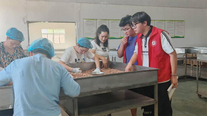 车间内,工人们正熟练地进行着食品制作,从原料筛选到成品包装,每一个环节都透露出对品质的严格把控。作为传统的老品牌,制作工艺都是采用人工的方式,并用白盐来进行炒制。团队成员仔细观察了生产流程,并在李总的介绍下了解各个生产环节的数据与特点,熟悉全部流程,并试吃了刚生产的花生米。