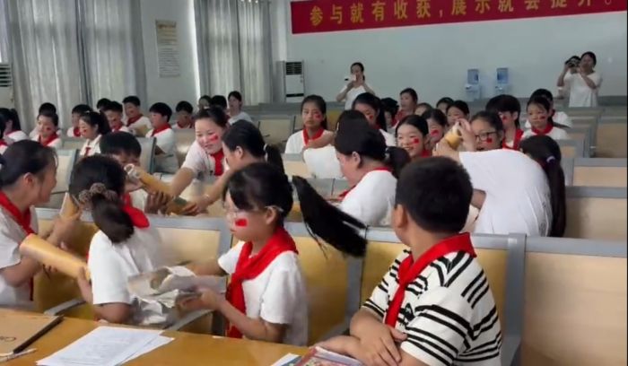 音乐课堂上,《闪闪的红星》的旋律在明德小学的教室中回荡。团队成员强薇不仅以丰富的形式教授孩子们学唱这首经典红歌,更讲述了歌曲背后的革命故事与“潘冬子”的勇敢精神。孩子们认真学唱,清澈的童声饱含情感,特别是唱到“红星闪闪放光彩”时,许多孩子的眼睛都亮了起来。“老师,我们要学习红色精神并发扬光大!”课末,孩子们踊跃举手,表达自己的理解。歌声成为传承的纽带,将红色的信念与理想悄然根植于童心。