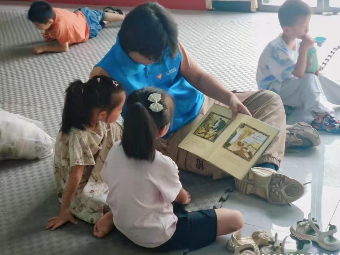 静思与探索:阅读区里,小朋友们专注聆听志愿者讲解童话绘本,好奇地询问“后来呢?”“后来呢?”;五子棋桌上,小朋友与志愿者仔细思考,缓下棋子。