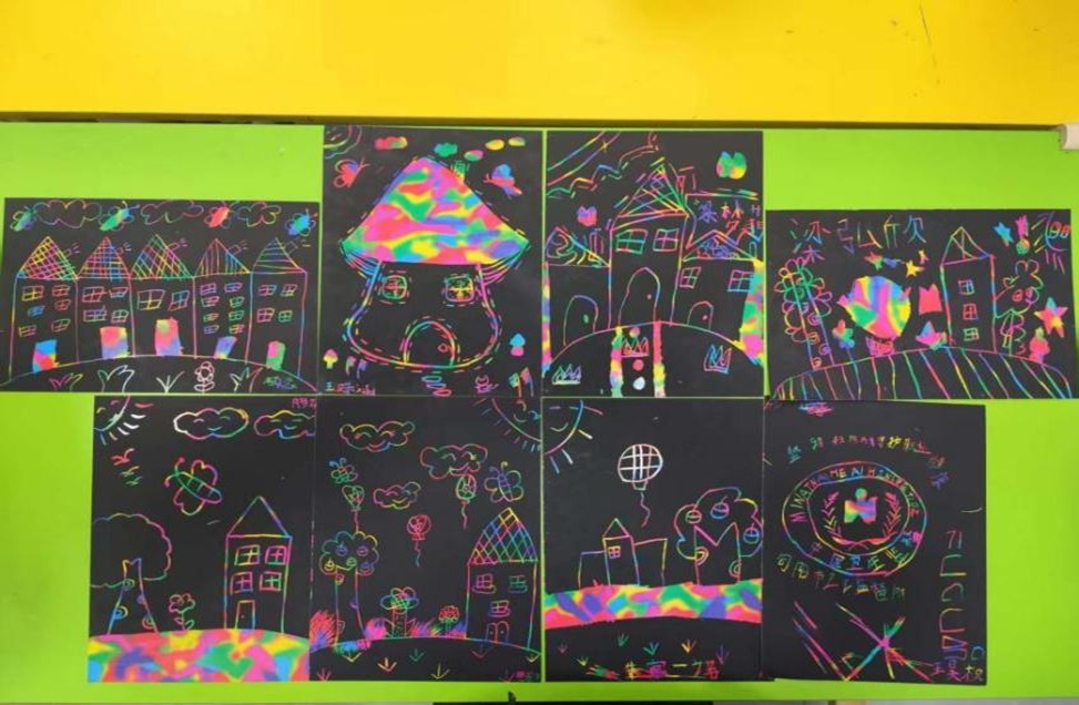 童心绘梦:刮画创作,小朋友的笔尖描出蘑菇云式的房子,绽出彩色的光芒,畅想未来在长方形房子的美好生活。
