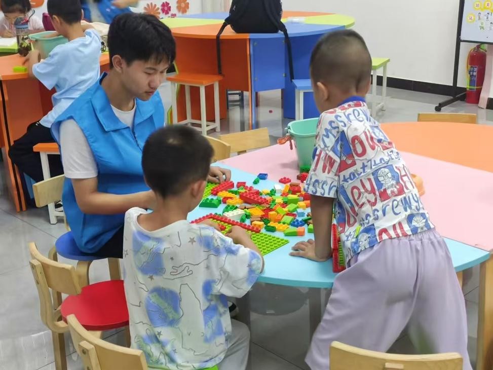 创意搭建:小朋友使用积木搭建模型,志愿者协助他们完成拼装,共同展现了“协作”的精神。