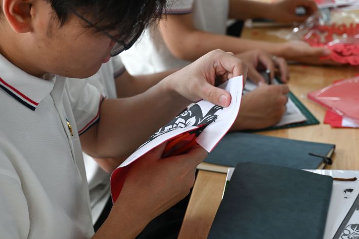 (图为实践团成员在剪纸社学习体验剪纸文化。 陈悦佳摄)