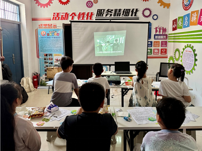 团队成员为孩子们播放成员们亲自策划拍摄的心理剧,通过生活中的具体事例,引导孩子们该如何解决问题,诉说自己内心的需求和困惑,不囿于其中。