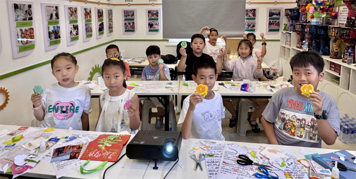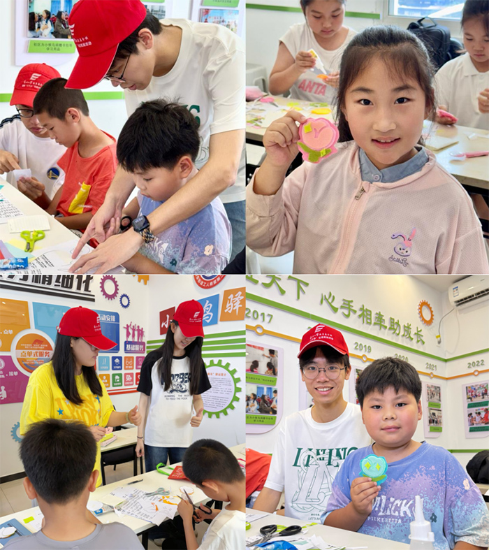 团队成员带领孩子们用不织布制作手工,最终组成相框,再将孩子们自己的照片和本次活动的照片贴上,用手工相框定格童年的美好瞬间。