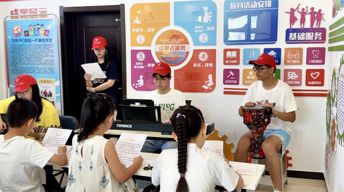 团队成员用钢琴、非洲鼓等乐器伴奏,为孩子们带来歌曲《稻香》的教学,用艺术荡涤孩子们的心灵,鼓励孩子们像歌词中那样,做一个乐观,坚强的人。