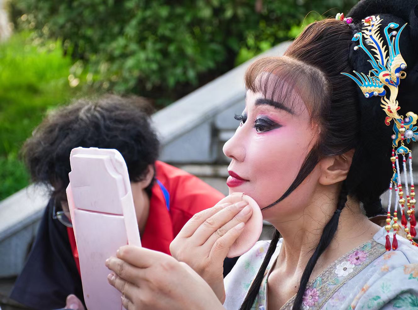 所谓的后台,竟只是一辆简陋的货车车厢。夏夜闷热,蚊虫成群 ,演员们就在这样的环境中化妆。他们连坐的地方都没有,看到队员们前来,还想把自带的小板凳让给大家坐。演员们所用的化妆品、服饰,都能看出明显的使用痕迹,部分因经费有限而难以更新 。最艰苦的是“勒头”的过程,用布带紧紧勒住头部以塑造脸型,常导致演员头昏脑胀 。