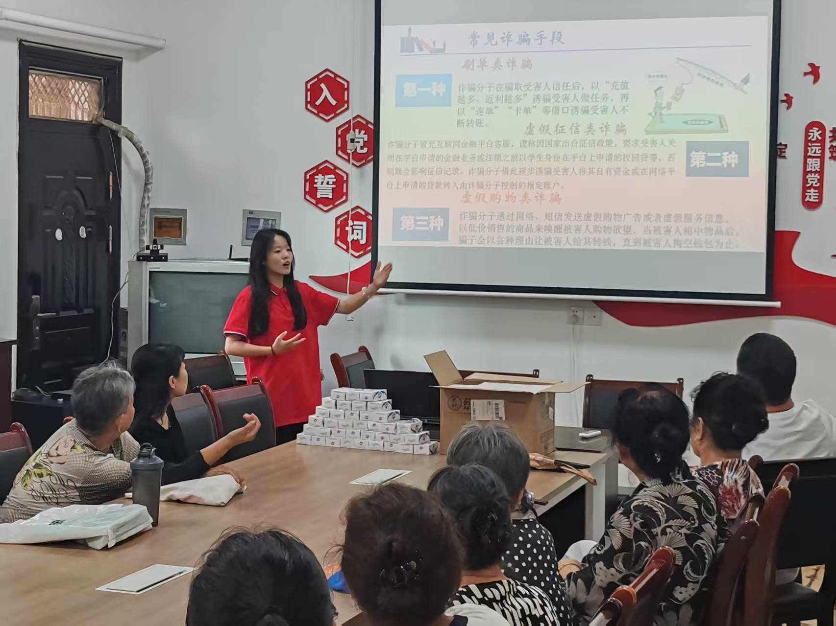 活动当天,反诈讲座吸引众多居民参与。队员们结合案例,深入浅出讲解电诈套路,传授识别与规避方法。现场发放宣传册和定制礼品,队员们一边派送,一边叮嘱居民保管好个人信息,不轻信陌生来电短信,转账汇款多核实,遇可疑情况及时报警。讲座中,“冒充客服促销”“假扮亲属借钱” 等案例引发共鸣,居民们纷纷点赞,称大学生讲的都是有用知识,宣传册清晰,会给家人学习,感谢志愿者普及知识,让大家知道如何护好“钱袋子”。70岁的王奶奶感慨,以前觉得电诈离自己很远,现在听了这些案例,尤其是冒充“孙子”要钱的,和电视新闻上报道的一样,以后自己会多留心。