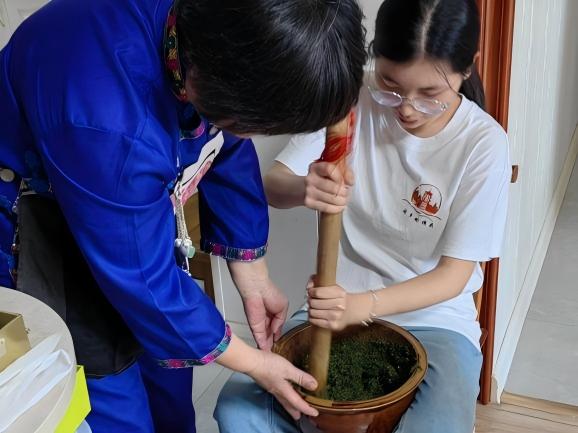 图2:实践队队员在江玫丽老师指导下参与擂茶制作工艺 胡婧琳通讯员摄