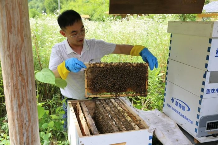 7月16日,重庆市石柱县中益乡华溪村,重庆外语外事学院“三下乡”负责人向实践团成员展示蜂巢。重庆外语外事学院西方语学院/供图