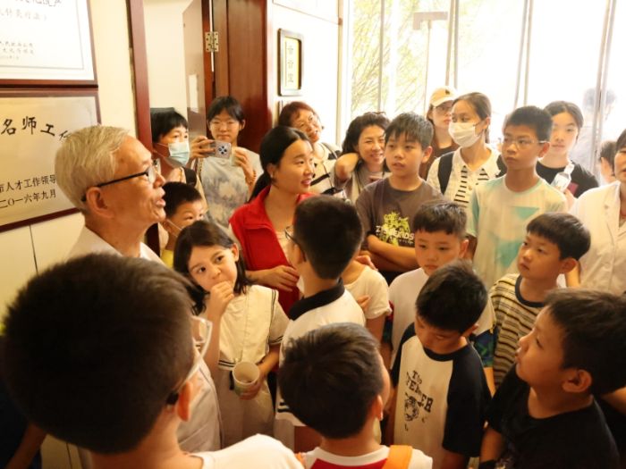 小郎中们跟针灸科医生阿姨了解人体穴位,去百草园里寻草药,到中医药文化展示馆看玳瑁,活动的高潮,是江苏省名中医、江苏省非物质文化遗产朱氏针法继承人、全国老中医药专家学术经验指导老师——朱新太介绍朱氏针法。 孩子们围在他身旁,目光紧紧追随着老先生。那一刻,“朱氏针法” 不再是一个抽象的名词或非遗的头衔,它化作了一种看得见、感受得到的神奇魅力,在老先生的介绍中,诉说着跨越时光的医道匠心。这份源自实践的震撼,深深印在了每一个小郎中的心里。