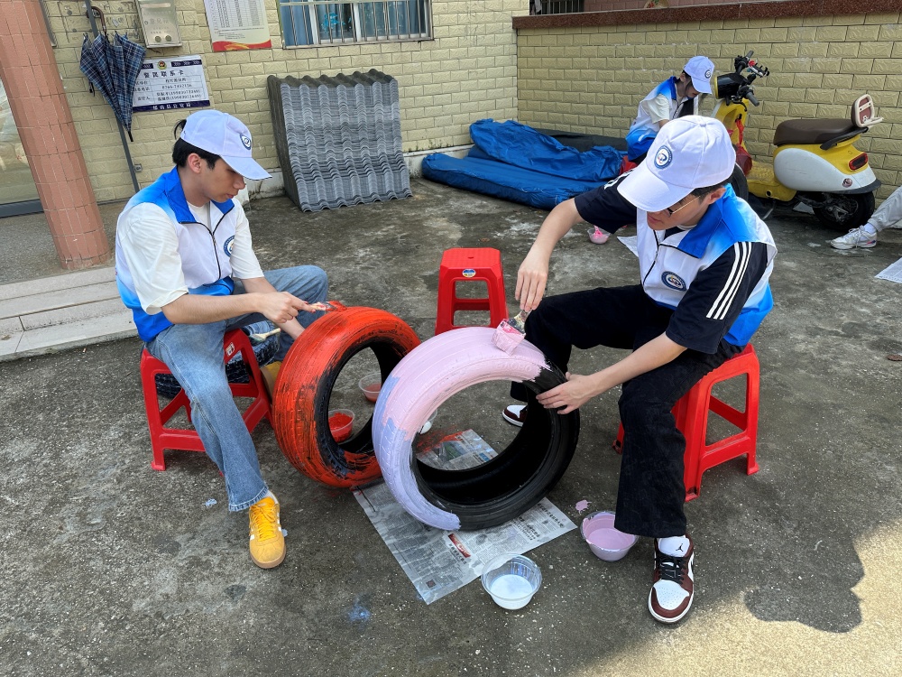 行走在桂圩镇的村落间,队员们不仅关注乡村的宏观发展,更用心发现其细微之美。他们化身“乡村美容师”,拿起画笔和颜料,赋予灰暗破旧的轮胎新的生命,使其成为独特的艺术画布。