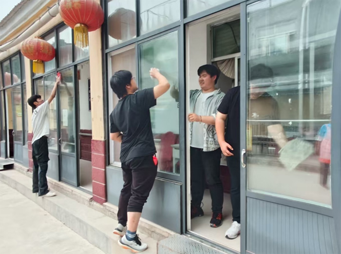 抵达当日,实践团成员便投入环境改善工作。志愿者分组协作,用浸湿的抹布反复擦拭门窗玻璃缝隙,清除沉积多年的污渍。经过三小时劳作,活动室玻璃透亮如新。
