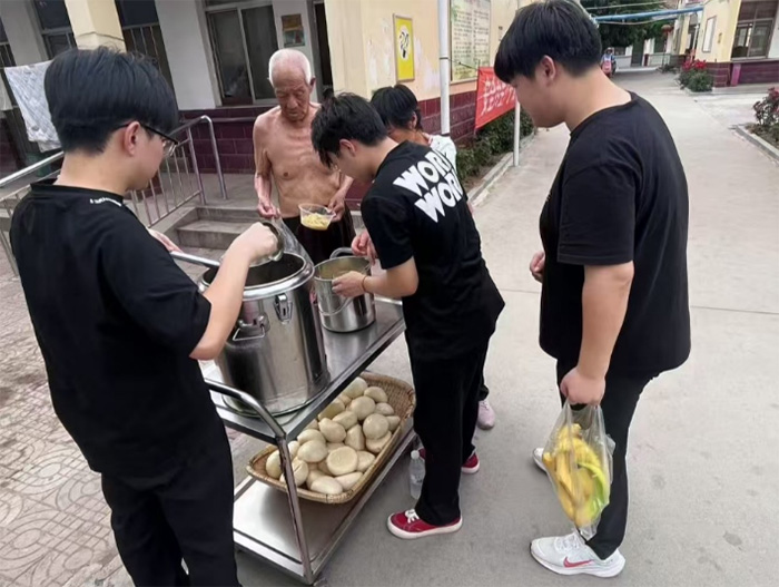 生活照料注重日常细节。每日清晨六点,厨房便出现团队成员身影,协助分装餐食。志愿者准时协助行动不便的老人端取餐食,耐心陪伴用餐过程。对于居室较远的老人,成员们主动上门送餐,确保其按时就餐。