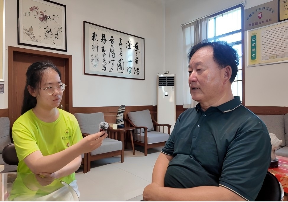 图为团队成员采访宣纸国家级非遗传承人伍森严。 王昊楠 摄