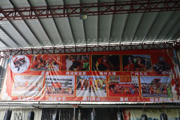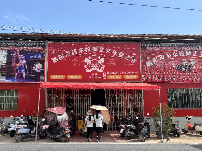 在塔头镇的街道旁,红墙亮眼的“揭阳市吴东松狮艺文化促进会”,是潮汕非遗传承的一方热血阵地。这里,藏着老板吴东松对英歌舞、狮艺的执着坚守。从热爱出发,这里不仅是英歌舞、武术、舞狮的传习所,更承载着潮汕人对非遗文化的深情。红墙之上,武术、英歌舞的宣传画,诉说着传承的故事,吸引着一批又一批热爱传统文化的人,在守护非遗的路上并肩前行。