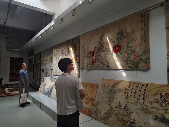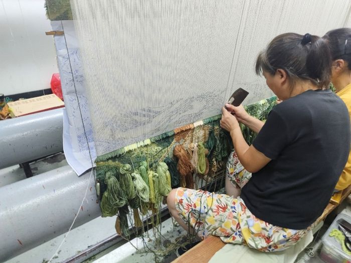 8月7日,团队深入如皋丝毯艺术博物馆。一幅幅流光溢彩的丝毯杰作,以百万计的“8”字手工绕结与精妙绝伦的剪花工艺,无声诉说着“一寸丝毯千寸心”的极致追求。在织造车间,匠人们指尖翻飞如梭,学生们得以零距离观察、触摸并尝试基础打结手法。丝线在指尖穿梭的韵律与力量,让学子们深刻体会到每一寸经纬间凝聚的专注与岁月。