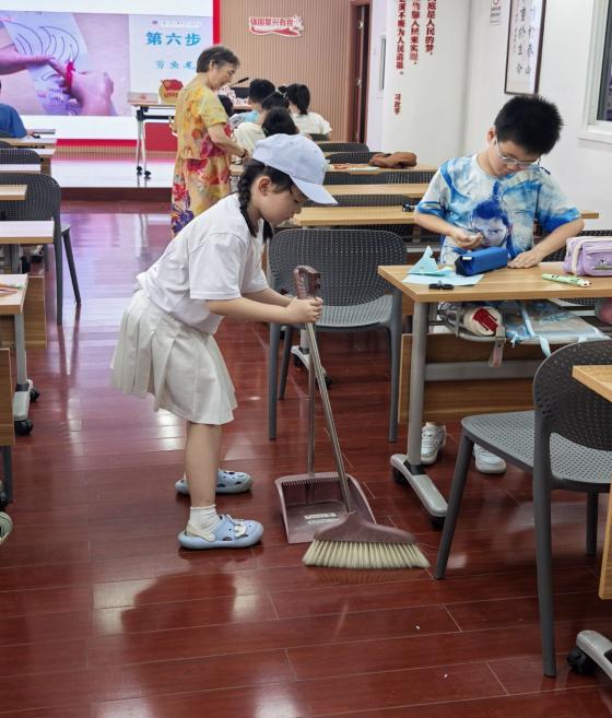 实操后,团队邀请儿童分享收获,小朋友们展示剪纸作品,以童真理解非遗与现实。活动尾声,小朋友主动帮忙整理场地,捡碎纸、分类投放边角料,用温情互动深化了非遗传承从认识到担当的进阶。