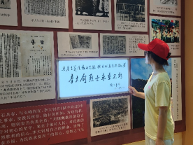 展陈馆内,珍贵文献、历史照片与场景复原再现了李大钊的一生。在《我的马克思主义观》手稿前,成员们屏息凝视泛黄的纸页,墨迹如刀刻般清晰。看着入门色彩绚丽的壁画,似乎能听见大钊先生“试看将来的环球,必是赤旗的世界”这振奋人心的呐喊。参观过程中,实践团采访到一位同学,邀请她发表了对爱国主义教育的看法,她说道:“爱国主义教育对于国家非常重要,尤其是对青少年来说,是成长过程中必不可少的一部分。”队员们纷纷记录,将激动转化为文字。