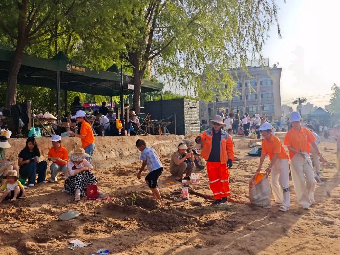 在调研同时,实践团的志愿行动也在火热开展。成员们化身“护河卫士”,手持垃圾夹、垃圾袋等工具清理各类垃圾。面对隐藏在草丛、石缝中的垃圾,他们不怕脏、不怕累,徒手捡起。志愿者们还向沿岸群众宣传生态保护知识。一位小朋友看到志愿者们的行动后,主动加入清理队伍,他表示:“我也要保护黄河,让它变得更干净。”